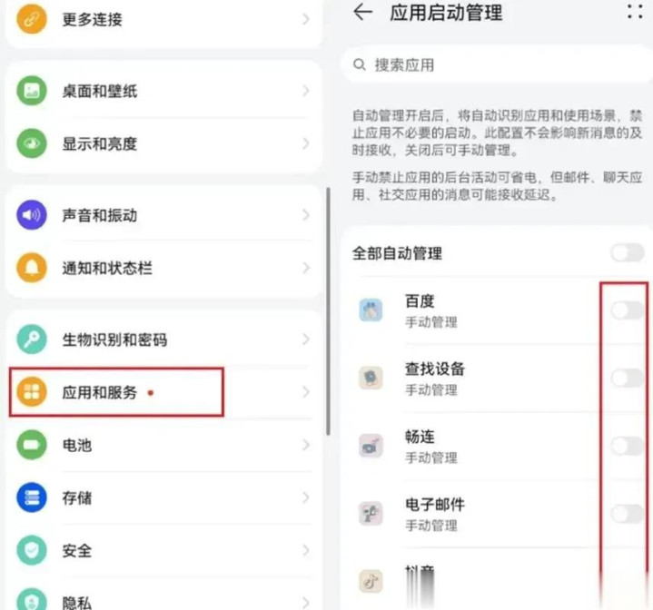 点开 “设置”,往下滑,找到 “应用和服务”;点进去后,找 “应用启动管理”;把里面 “自动启动” 的开关关掉,不让 APP 自己偷偷跑后台。