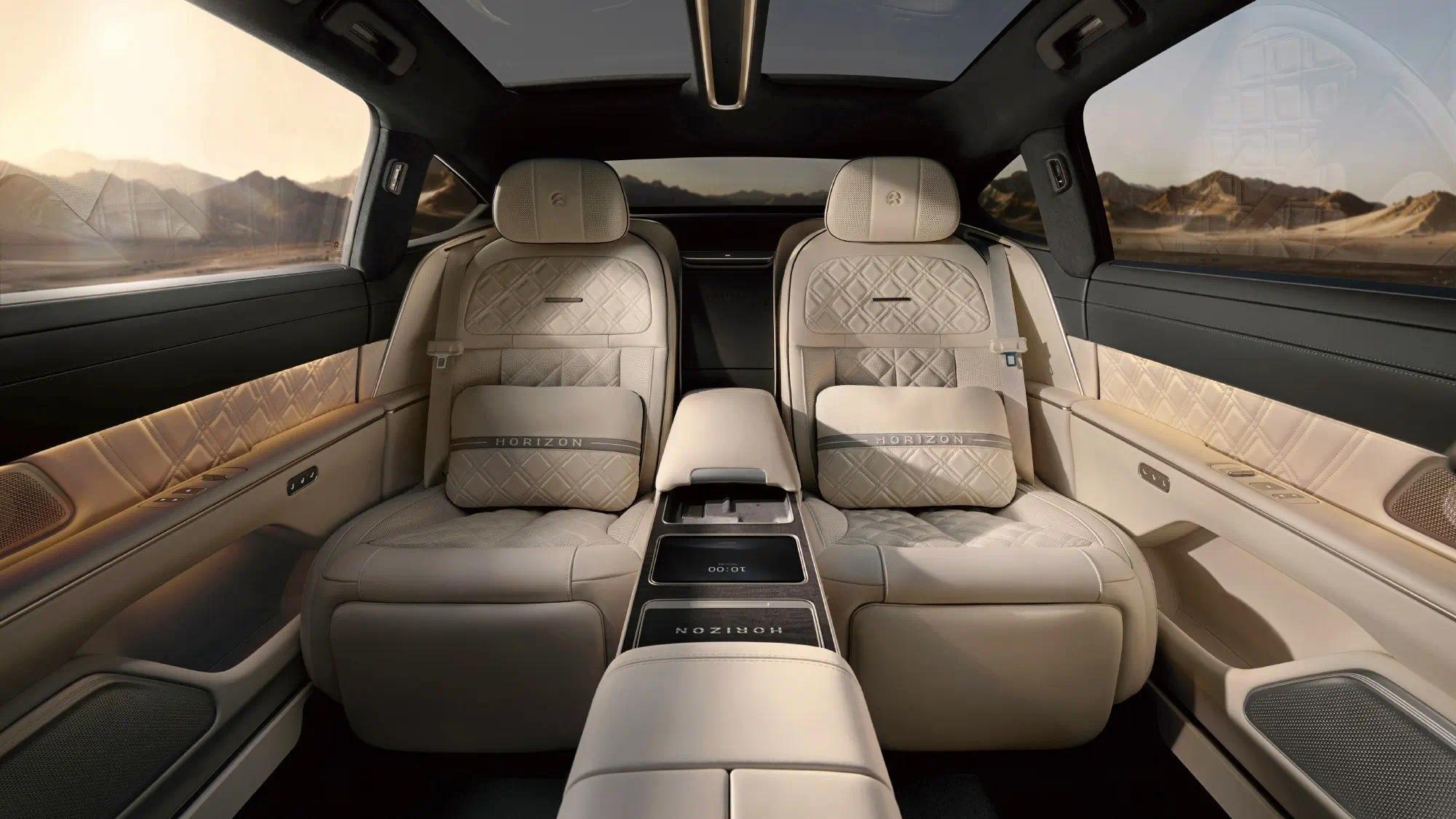 作为“Horizon Edition”系列中的轿车车型,它们拥有最为奢华的配置规格,并辅以精致考究的内饰细节——包括饰有浮雕纹理的皮革材质,以及随处可见的“Horizon”专属标识(例如车门迎宾踏板及可拆卸式真皮靠垫上的铭文)。限量特别版起售价为81.8万元,而蔚来ET9的基础版目前售价为76.8万元。